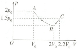 (1)AB是双曲线的一部分,则气体从A到B做等温变化,则有$T_B = T_A = T_0$。根据玻意耳定律有$2p_0V_0 = p_B · 2V_0$。解得$p_B = p_0$。气体从B到C过程,根据理想气体状态方程有$\frac{p_B · 2V_0}{T_B}=\frac{1.5p_0 · 2.2V_0}{T_C}$。解得$T_C = 1.65T_0$。