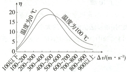 5.(2025湖南湘西期末) 一定质量的某种气体在0 ℃和100 ℃下的分子速率分布规律如图所示。横坐标$\Delta v$表示分子速率区间,纵坐标$\eta$表示某速率区间内的分子数占总分子数的百分比,以下对图线的解读中正确的是 (
