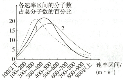4.(2025湖北襄阳期中) 如图所示为氧气分子在不同温度下的气体分子速率分布规律图像,图中实线1、2对应的温度分别为$T_1$、$T_2$。下列说法正确的是 (