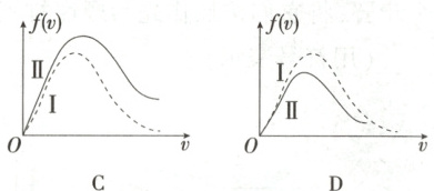 3.(2025江苏南京联考) 气缸内封闭有一定质量的气体,在某次压缩过程中,缸内气体的温度从$T_1$迅速升高至$T_2$。下列各图中,纵坐标$f(v)$表示各速率区间的分子数占总分子数的百分比,图线Ⅰ、Ⅱ分别为缸内气体在$T_1$、$T_2$两种温度下的分子速率分布曲线,其中正确的是 (