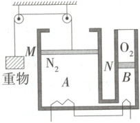 6.(2025 湖北武汉期中) 如图所示, 内看视颎壁光滑、厚度不计的绝热汽缸 $A 、 B$, 其底部由体积可忽略的细管连通, $A$ 上端与大气连通, $B$ 上端封闭。$A 、 B$ 汽缸中分别有厚度可忽略的绝热活塞 $M 、 N, A 、 B$ 汽缸的横截面积分别为 $4 S 、 S$, 两汽缸的高度都为 $h$。两活塞下方充有氮气, 活塞 $N$ 上方充有氧气。轻质且不可伸长的细绳连接活塞 $M$, 绕过光滑的定滑轮与重物连接。当大气压为 $p_{0}$ 、外界和汽缸内气体温度均为 $7^{\circ} \mathrm{C}$ 时系统处于静止状态, 此时活塞 $M$ 离汽缸顶的距离为 $\frac{1}{4} h$, 活塞 $N$ 离汽缸顶的距离为 $\frac{1}{2} h$。活塞 $M$ 的质量为 $\frac{p_{0} S}{g}$, 重物的质量和活塞 $N$ 的质量均为 $\frac{p_{0} S}{4 g}$, 整个过程不漏气, 气体均可视为理想气体, 重力加速度为 $g$, 热力学温度 $T$ 与摄氏温度 $t$ 的关系为 $T=t+273 \mathrm{~K}$。