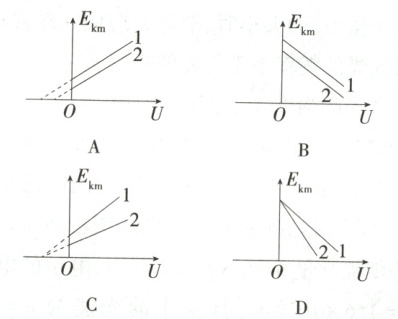 5.(2025 湖南名校联考,改编)如图所示,分别用 1、2 两种金属材料作 K 极进行光电效应探究,其逸出功的大小关系为 $W_1 < W_2$,保持入射光不变,则光电子到达 A 极时动能的最大值 $E_{km}$ 随电压 $U$ 变化关系的图像是 (