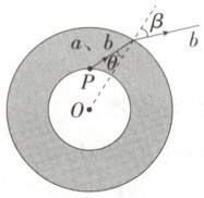 8.(2025 安徽合肥联考)“天宫课堂”中,航天员演示了微重力环境下的神奇现象,液体呈球状,往其中央注入空气,可以在液体内部形成一个同心球形气泡。液体球和同心球形气泡可简化为空心透明球壳模型,图示为该球壳截面图,$O$ 为球壳的球心。若液体球壳内表面的 $P$ 点有一个点光源,可发出两种不同频率的单色光 $a$ 和 $b$。当图中 $\theta = 30°$ 时,$a$ 光恰好不能从液体球壳的外表面射出,$b$ 光射出的折射角 $\beta = 45°$。已知真空中的光速为 $c$。则 (