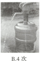 设至少需要把气囊完全压下n次,才能有水从出水管流出,设大气压强为$p_0,$水桶内气体体积为$V_0,$气囊体积为$V_1,$根据玻意耳定律可得$p_0(V_0+nV_1)=p_1V_0,$其中$p_0=\rho gh=\rho g × 10 m,$$V_0=\pi(\frac{24}{2})^2 × (35-5) cm^3=4320\pi cm^3,$$V_1=\pi(\frac{6}{2})^2 × 8 cm^3=72\pi cm^3,$$p_1=p_0+\rho g(0.3 m+0.1 m)=\rho g × 10.4 m,$联立解得n=2.4,则至少需要把气囊完全压下3次。