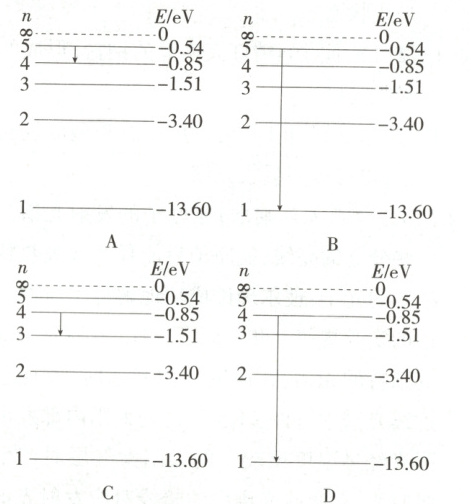 9.(2025 广东湛江期中)已知处于某一能级$n$上的一群氢原子向低能级跃迁时,能够发出10种不同频率的光,下列能表示辐射光波长最长的跃迁的示意图是 (