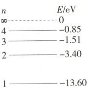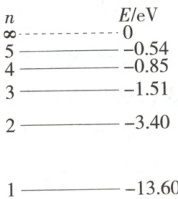 (2)电离能是氢原子从某一能级跃迁到 n = ∞ 时所需吸收的能量,其数值等于氢原子处于各定态时的能级值的绝对值。如处于基态的氢原子的电离能是 13.6 eV,处于 n = 2 激发态的氢原子的电离能为 3.4 eV。