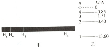 3.(2025 北京东城一模)如图甲为氢原子光谱示意图,图乙为氢原子部分能级示意图。图甲中的$H_{\alpha}$、$H_{\beta}$、$H_{\gamma}$、$H_{6}$是氢原子在可见光区的四条谱线,这四条谱线为氢原子从$n\geq3$能级向$n = 2$能级跃迁时产生的。已知可见光的光子能量范围为1.62~3.11 eV。下列说法正确的是 (
