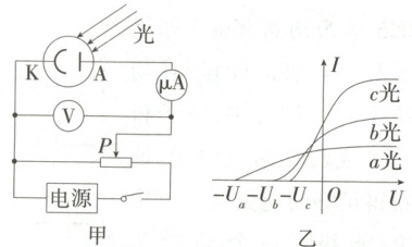 1.B 一群处于n=4能级的氢原子,向低能级跃迁过程中能发出6种不同频率的光,按光子能量由大到小排列为n=4→n=1、n=3→n=1、n=2→n=1、n=4→n=2、n=3→n=2、n=4→n=3,实验中只测得3条电流随电压变化的图像,所以照射到图甲电路阴极K的金属上,发生光电效应的光子对应的跃迁为n=4→n=1、n=3→n=1、n=2→n=1,故该金属的逸出功大于$E_{42}=E_4 - E_2=-0.85 eV-(-3.4 eV)=2.55 eV,$A错误;由乙图可知,a光的遏止电压最大,其次是b光,最小的为c光,可知,a光的频率最大,c光的频率最小,故其波长关系为$\lambda_a<\lambda_b<\lambda_c,$B正确;a光光子能量最大,应是氢原子由n=4能级向n=1能级跃迁时发出的,C错误;处于n=1能级的氢原子跃迁到n=2能级时,需要吸收的能量$\Delta E=E_2 - E_1=-3.4 eV-(-13.6 eV)=10.2 eV,$动能为10.5 eV的电子与处于n=1能级的氢原子碰撞,电子可以将一部分能量转移给氢原子,使氢原子发生跃迁,D错误。