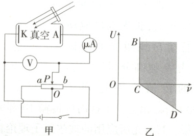 2. (2025 浙江嘉兴模拟)如图甲为研究光电效应的实验电路,图乙纵坐标为实验中 A、K 间的电压 $U$ (A 电势高于 K 为正),横坐标为人射光的频率 $\nu$,$BC$ 为平行于 $U$ 轴的直线,$CD$ 是一条斜率绝对值为 $k$ 的直线,$C$ 点的坐标为 $(b,0)$,图中阴影部分表示能产生光电流的区域。现有大量氢原子处于某激发态,在向低能级跃迁时只能放出 1 种可见光,且该可见光恰好能使实验所用的金属材料发生光电效应,已知氢原子各能级关系为 $E_n = \frac{E_1}{n^2}$,其中 $E_1$ 为基态能级值,量子数 $n = 1,2,3,·s$,电子电荷量为 $e$,光速为 $c$,则下列说法不正确的是( )