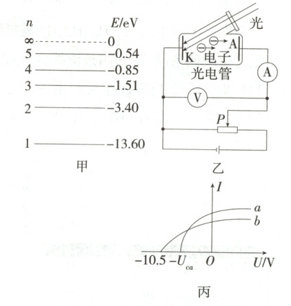 3.(2025 江苏苏州期末)图甲是氢原子的能级图,一群处于 $n = 4$ 激发态的氢原子自发跃迁,辐射出的光子中仅有 $a、b$ 两种光能使图乙中的光电管电路产生光电流,测得产生的光电流 $I$ 与其对应电压 $U$ 的关系曲线如图丙所示。求: