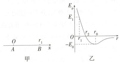 7.(2025 浙江宁波期末)如图甲所示,将两个完全相同、质量均为$m$的分子$A$、$B$同时从$x$轴上的坐标原点和$r_1$处由静止释放,图乙为这两个分子的分子势能随分子间距离变化的图像,当分子间距离分别为$r_1$、$r_2$和$r_0$时,两分子之间的分子势能为$E_1$、$0$和$-E_0$。取分子间距离为无穷远时分子势能为零,整个运动过程只考虑分子间的作用力,下列说法正确的是 (