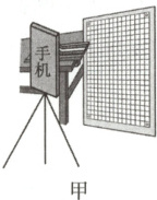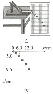 (填“甲”或“乙”)同学的方法更合理。(3) 从视频中截取连续的多帧图片,合成出如图乙所示的图片,已知实验所用的坐标纸最小正方形边长为$ 1 \, cm $,相邻两帧之间的时间间隔为$ \dfrac{1}{30} \, s $,小马从图片中读取了七个连续小球的位置信息如图丙所示,图中$ y $轴对应竖直方向,坐标原点不对应平抛起点,则小球平抛运动的水平分速度为