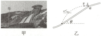 1.(2025北京北师大附中月考) 如图甲所示为2022年北京冬奥会的跳台滑雪场地“雪如意”,其主体建筑设计灵感来自于中国传统饰物“如意”,其部分赛道可简化为如图乙所示的轨道模型。斜坡可视为倾角为$\theta$的斜面,质量为$m$的运动员(可视为质点)从跳台$a$处以速度$v$沿水平方向向左飞出,不计空气阻力。则运动员从飞出至落到斜坡上的过程中,已知重力加速度为$g$,下列说法正确的是 (