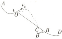 8.(2025 江西鹰潭一模)2025 年 2 月 10 日,江西籍运动员杨文龙在哈尔滨亚冬会单板滑雪男子大跳台决赛中勇夺金牌。如图为简化后的跳台滑雪雪道示意图,$AO$段为助滑道和起跳区(倾角为$\alpha$),$OB$段为倾角为$\beta$的着陆坡,$BD$为停止区。运动员从助滑道的起点$A$由静止开始下滑,到达起跳点$O$时,借助设备和技巧,以与水平方向成$\alpha$角(起跳角)的方向起跳,最后落在着陆坡面上的$C$点。已知运动员在$O$点以$v_0$的速率起跳,轨迹如图中虚线所示,不计一切阻力,重力加速度为$g$。求: