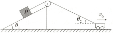 1.(2025 安徽蚌埠三校联考)质量为$m$的物块$P$置于倾角为$\theta_1$的固定光滑斜面上,轻质细绳跨过光滑定滑轮分别连接着物块$P$与小车,物块$P$与滑轮间的细绳平行于斜面,小车以速率$v_0$水平向右做匀速直线运动。已知重力加速度为$g$,当小车与滑轮间的细绳和水平方向成$\theta_2$角时,下列判断正确的是 (