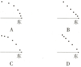 4.(2024 江苏苏州张家港调研)飞机向东水平匀减速飞行,每隔相等时间抛下一物,则在地面上的人看到物体在空中的排布情况应是 (