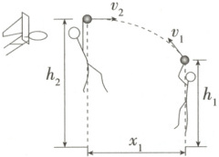 3.(2025 陕西咸阳模拟)如图所示,封盖也叫“盖帽”,是篮球比赛中常用的防守方式。投篮运动员出手点离地面的高度$h_1 = 2.75 m$,封盖的运动员击球点离地面的高度$h_2 = 3.20 m$,两运动员竖直起跳点间的水平距离$x_1 = 0.60 \text{ m$。封盖运动员击球时手臂竖直伸直,这时篮球及封盖运动员均恰好运动至最高点,击球后,篮球以击球前速度的 3 倍水平飞出。已知封盖运动员站立单臂摸高$h = 2.40 \text{ m$,取重力加速度$g = 10 m/s^2$,不计空气阻力,篮球可视为质点。下列说法正确的是 (