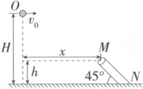 2.(2025 四川泸州期末)如图所示,光滑直管$MN$倾斜固定在水平地面上,直管与水平地面间的夹角为$45°$,管口到地面的高度为$h = 0.4 m$;在距地面高为$H = 1.2 \text{ m$处有一固定弹射装置(图中未画出),可以沿水平方向弹出直径略小于直管内径的小球。某次弹射的小球恰好无碰撞地从管口$M$处进入管内,设小球弹出点$O$到管口$M$的水平距离为$x$,弹出时小球的初速度大小为$v_0$,重力加速度$g$取$10 m/s^2$,不计空气阻力。关于$x$和$v_0$的值,下列选项正确的是 (