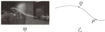 10.(2025 江苏苏州一中月考) 利用风洞实验室为运动装备风阻性能测试和运动姿态风阻优化在我国已大量运用在各类比赛项目中, 帮助运动员提高成绩。为了更加直观地研究风洞里的流场环境, 我们可以借助丝带和点燃的烟线辅助观察, 如图甲所示。在某次实验中获得一烟尘颗粒从$P$点到$Q$点做曲线运动的轨迹, 如图乙所示, 不计烟尘颗粒的重力, 下列说法正确的是 (
