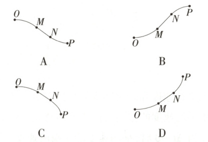 9. 教材习题改编 一个物体在光滑水平面上运动,当物体运动到位置$O$时,受到向前偏左(沿着物体运动方向观测,下同)的合力$F$作用,如图所示。到达$M$时,这个合力$F$的方向突然变得与前进方向相同。到达$N$时,合力的方向又突然改为向前偏右,物体最终到达$P$。则物体由$O$至$P$的运动轨迹可能为 (
