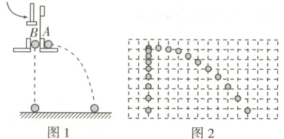(2) 图1所示的实验中,$A$球沿水平方向抛出,同时$B$球自由落下,借助频闪照片,通过分析图2为某次实验的频闪照片。在误差允许范围内,根据任意时刻两球的竖直高度相同,可判断$A$球竖直方向做