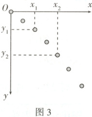 (4) 某同学实验时忘了标记重垂线方向。为解决此问题,他在频闪照片中,以某位置为坐标原点,沿任意两个相互垂直的方向作为$x$轴和$y$轴正方向,建立直角坐标系$xOy$,并测量出另外两个位置的坐标值$(x_1,y_1)$、$(x_2,y_2)$,如图3所示。根据平抛运动规律,利用运动的合成与分解的方法,可得重垂线方向与$y$轴间夹角的正切值为