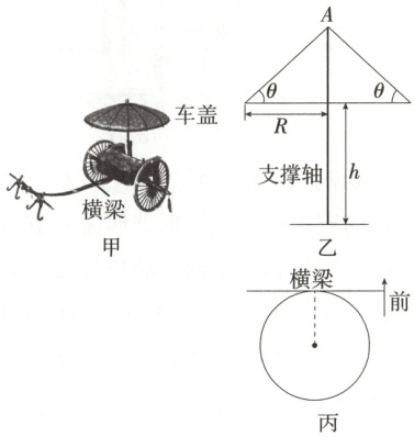6. (2025 山东枣庄期中) 春秋末年,齐国的《考工记》中记载:“欲为窻而宇欲卑,为尊而宇卑,涂欲水,疾而霤远。”意思是说,车盖中央高而四周低,形成一个斜面,泄水很快,而且水流得更远。如图甲所示为古代马车示意图,车盖呈伞状,支撑轴竖直向上,伞底圆面水平。过支撑轴的截面图简化为如图乙所示的等腰三角形,底面半径恒定为$R$,底角为$\theta$。取不同的$\theta$值时,自车盖顶端$A$由静止下滑的水滴(可视为质点)沿伞面运动的时间不同。已知重力加速度为$g$,不计水滴与伞面间的摩擦和空气阻力。