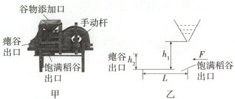 5. (2025 湖南娄底·湘豫联盟联考) 如图甲所示的风车是一种过滤水稻等农作物的农具。风车工作时,转动摇动手杆,扇叶转动,静止释放的谷物会受到一个水平向左的恒定风力$F$(扇叶转动速度越高,$F$越大),如图乙所示,饱满稻谷和瘪谷分别从各自出口流出。已知谷物添加口与饱满稻谷出口上端的高度差为$h_1$,谷物添加口与瘪谷出口间水平距离为$L$,瘪谷出口高度为$h_2$且下端与饱满稻谷出口上端在同一水平面上,不计空气阻力,重力加速度大小为$g$,下列说法正确的是 (