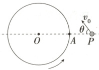 8.(2024 山东菏泽期中) 如图所示,竖直圆盘绕过圆心$O$的水平轴逆时针匀速转动,$A$点是圆盘边缘上的点。圆盘转至$OA$水平时,将一小球从$A$点右侧的$P$点($A$、$O$、$P$在同一直线上)斜向左上方抛出,初速度大小$v_0 = 5 m/s$,与水平方向的夹角$\theta = 53°$。当$A$点转到圆盘最高点时,小球也恰好到达圆盘最高点,且轨迹与圆盘最高点相切。不计空气阻力,重力加速度$g = 10 m/s^2$。$\sin 53° = 0.8$,$\cos 53° = 0.6$。求: