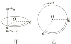 7.(2025 河北张家口月考) 如图甲所示,在水平圆盘上$\overgroup{ab}$之间有圆心角为$120°$的开槽,圆盘以角速度$\omega$顺时针匀速转动,在$\overgroup{ab}$的端点$a$点正上方$1 m$处有一直径略小于槽宽的小球,小球以$4 m/s$的初速度竖直上抛,若要令小球落入槽中,不计空气阻力,重力加速度$g = 10 m/s^2$。下列说法正确的是(