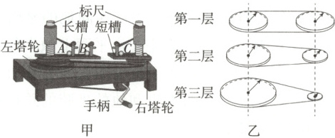 4.(2025 江苏苏州第十中学月考)“探究向心力大小的表达式”的实验装置如图甲所示。已知小球在挡板 A、B、C 处做圆周运动的轨道半径之比为 1 : 2 : 1,变速塔轮自上而下有如图乙所示三种组合方式传动,左右每层半径之比由上至下分别为 1 : 1、2 : 1 和 3 : 1。