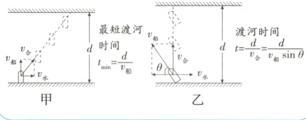 以最短时间过河,船头正对河对岸,渡河模型如图甲所示;以最短位移过河,合速度方向与河岸垂直,渡河位移大小等于河宽,渡河模型如图乙所示。