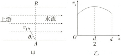 5.(2025江苏南京六校联合体调研)在静水中速度为$v_1$的小船,为垂直渡过宽度为$d$的河流,船头与河岸成$\theta$角斜向上游,如图甲所示。航行中发现河水流速$v_s$与到$A$河岸的距离$x$的关系如图乙所示。为使小船仍能到达正对岸,下列措施中可行的是 (