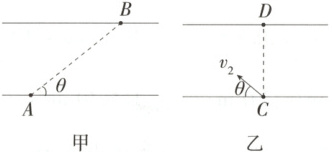 4.(2025福建福九联盟期中联考)河水流速不变,一人划船过河,第一次划船速度为$v_1$,以最短时间过河,航行路径如图甲所示。第二次划船速度为$v_2$,以最短位移过河,航行路径如图乙所示。结果两次船的渡河时间相等,已知路径$AB$与下游河岸的夹角为$\theta(0°<\theta<90°)$,路径$CD$与河岸垂直,如图所示,下列说法正确的是 (