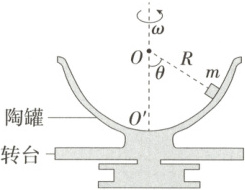 2.(2025 江苏苏州南航附中期中)如图所示,半径为 R 的半球形陶罐,固定在可以绕竖直轴转动的水平转台上,转台转轴与过陶罐球心 O 的对称轴 $OO'$ 重合。转台以一定角速度匀速转动,一质量为 m 的小物块落入陶罐内,经过一段时间后小物块随陶罐一起转动且相对罐壁静止,此时小物块受到的摩擦力恰好为 0,且它和 O 点的连线与 $OO'$ 之间的夹角 θ 为 60°,重力加速度为 g,下列说法不正确的是 (