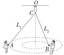 7.(2025 江苏南京六校联合体联考)如图所示,C 为可绕过 O 点竖直轴转动的光滑小圆环。质量分别为 $m_1$、$m_2$ 的妹妹和哥哥分别拉住穿过圆环的细绳两端 A、B,绕 C 在空中做圆锥摆运动,运动的周期相等,AC、BC 长分别为 $L_1$、$L_2$。不计空气阻力,人可视为质点,则下列判断正确的是 (