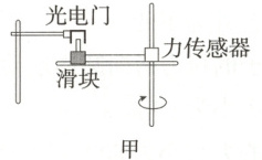 8.(2025 河北石家庄联考)某实验小组对水平面内的圆周运动进行探究,装置如图甲所示。滑块套在水平杆上,随水平杆一起绕竖直杆做匀速圆周运动,力传感器通过一细绳连接滑块,用来测量细绳拉力 F 的大小,滑块上固定一遮光片,宽度为 d,遮光片与固定在铁架台上的光电门可测量滑块的角速度 ω,滑块旋转半径为 r,最大静摩擦力等于滑动摩擦力。
