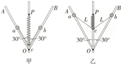 一转动装置如图甲所示,两根足够长轻杆$OA$、$OB$固定在竖直轻质转轴上的$O$点,两轻杆与转轴的夹角均为$30°$。小球$a$、$b$分别套在两杆上,小环$c$套在转轴上,球与环质量均为$m$。$c$与$a$、$b$间均用长为$L$的细线相连,原长为$L$的轻质弹簧套在转轴上,一端固定在轴上$P$点,另一端与环$c$相连。当装置以某一转速转动时,弹簧伸到$1.5L$,环$c$静止在$O$处,此时弹簧弹力等于环的重力,球和环间的细线刚好伸直而无拉力。弹簧始终在弹性限度内,忽略一切摩擦和空气阻力,重力加速度为$g$。