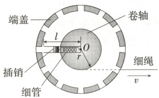 当插销刚卡进固定端盖时,弹簧的伸长量为$\Delta x = \frac{l}{2}$ 由胡克定律知,弹簧弹力$F = ml\omega^2$,对插销,由弹簧弹力提供向心力,$F = ml\omega^2$,解得$v = r\omega$,对卷轴有$v = r\omega$