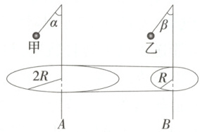 4.(2024 河南南阳月考) 如图所示,同一水平面内的皮带轮$A$、$B$通过不打滑的皮带传动,$A$轮的半径是$B$轮的$2$倍。在皮带轮各自的轴上用长度相同的轻绳分别悬挂质量为$m_ 甲$和$m_ 乙$的甲、乙两个小球,二者质量关系满足$m_ 甲 = 4 m_ 乙$。两轻绳上端的悬挂点足够高且在同一水平面上,通过外力驱动$A$轮,待系统稳定转动后,两轻绳与轴的夹角分别为$\alpha$和$\beta$。下列说法不正确的是 (