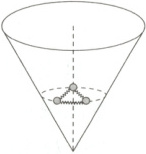 5.(2025 北京师大附中期中) 如图所示,地面上固定一个内壁光滑的圆锥筒,其轴线竖直且轴截面为等边三角形。现有三个质量均为$m$的相同小球(两两间连接完全相同的轻质弹簧)在筒内壁的某个水平面内以角速度$\omega$匀速旋转,此时弹簧均处于原长状态。已知这三个小球在弹簧均处于$2$倍原长时的水平面内仍能以角速度$\omega$匀速旋转,重力加速度为$g$。下列说法不正确的是 (