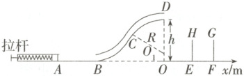 6.(2023 广东汕头金山中学期中) 如图 所示为某弹射游戏装置示意图,通过拉杆将弹射器的轻质弹簧压缩后释放,将质量为$0.1\ kg$的小滑块从$A$点水平弹出,滑行一段距离后经过$B$点,无碰撞地进入圆弧式细口径管道$BCD$,最后从$D$点水平飞出,并抛入在平台上的收集框$EFGH$中。小滑块与框底部碰撞后水平方向分速度不变,竖直方向分速度大小不变,方向竖直向上。整个轨道处在同一竖直面内,其中$CD$部分为半径$R = 0.4\ m$的圆弧管道,其圆心为$O_1$。管口$D$点距平台的高度$h = 0.45\ m$,以$D$点正下方平台上的$O$点为原点向右建$x$轴。已知$HE = EF = GF = d = 0.25\ m$。管的口径远远小于圆弧半径,不计空气阻力、滑块的大小和框的厚度,重力加速度$g$取$10\ m/s^2$。