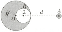 4.[教材 深研拓展] 如图所示,在半径为$R$、质量均匀分布的某个球体中,挖出一半径为$\frac{R}{2}$的球形空穴,空穴跟球体相切,另一均匀小球的球心位于空穴中心与空穴跟球体的切点连线所在直线上的$A$处,小球球心与球形空穴中心间的距离为$d = 2R$,引力常量为$G$,已知带空穴的球体与小球之间的万有引力大小为$F_0$。现将小球向左移动使得$d = \frac{3R}{2}$,这时球体与小球间的引力$F$与$F_0$的比值约等于 (