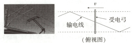 6.(2025江苏泰州开学考)如图所示,高铁列车上方输电线呈水平折线形架设,横向固定在车厢上方的受电弓与输电线紧密接触。当高铁列车以大小为$v$的速度向前匀速运动时,受电弓与输电线交点的移动速度大小为$v_1$,受电弓受到输电线的摩擦力为$f$,则 (