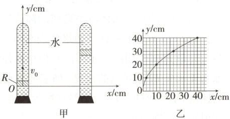 9.如图所示,在一端封闭的光滑细玻璃管中注满清水,水中放一个红蜡做成的小圆柱体$R$($R$可视为质点)。将玻璃管的开口端用胶塞塞紧后竖直倒置且与$y$轴重合,$R$从坐标原点$O$以速度$v_0=10 \text{ cm/s$匀速上浮的同时,水平向右移动玻璃管,用$y$表示$R$竖直方向的位移,用$x$表示$R$随玻璃管通过的水平位移,$t=0$时刻$R$位于坐标原点,描出$R$的运动轨迹如图乙所示。下列说法正确的是 (