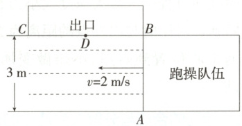 7.(2024江苏扬州中学期末)如图所示为某校学生跑操的示意图,跑操队伍宽$d=3 m$,某时刻队伍前排刚到达出口的$B$端,正在$A$点的体育老师准备从队伍前沿直线匀速横穿到达对面出口$BC$,且不影响跑操队伍,已知学生跑操的速度大小为$v=2 m/s$,出口$BC$宽度$L=4 m$,$D$为$BC$的中点,则以下说法正确的是 (