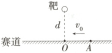 8. 创新题| 新情境 (2025安徽合肥第六中学期中)如图所示,运动员在平直的赛道上沿直线进行骑马射箭训练。已知马的速度恒为$v_0=12 m/s$,靶心到赛道的垂直距离为$d=48 m$,垂足为$O$点。若运动员在$A$点将箭倾斜向上射出恰好能击中靶心,且射出时箭的水平速度大小为v_1=16 m/s(以运动员为参考系),方向垂直赛道。若靶心与射箭点在同一水平面,忽略空气阻力,重力加速度大小$g=10 m/s^2$,则 (
