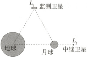 3.(2025 湖南长沙长郡中学月考)地球和月球可视作一个双星系统,它们同时绕它们连线上的$A$ 点转动,同时在这个转动的平面内存在五个拉格朗日点,在这些点上的卫星能够在地球和月球的引力共同作用下也绕$A$ 点转动,并且在转动过程中与地球和月球的相对位置保持不变。如图所示,在拉格朗日点$L_2$ 处存在一个中继卫星,它的主要作用是用于登月行动的通信;在拉格朗日点$L_4$ 处存在一个监测卫星,与地球球心、月球球心的连线恰构成一个等边三角形,其主要作用是监测其他月球卫星的工作情况。若地球的质量为月球的$81$ 倍,则下列说法正确的是 (