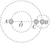 4.(2024 江苏南京金陵中学月考)如图所示,恒星$A$、$B$ 构成的双星系统绕点$O$ 沿顺时针方向做匀速圆周运动,运动周期为$T_1$,它们的轨道半径分别为$R_A$、$R_B$,$R_A<R_B$。$C$ 为$B$ 的卫星,绕$B$ 做逆时针方向的匀速圆周运动,周期为$T_2$,忽略$A$ 与$C$ 之间的万有引力,且$A$ 与$B$ 之间的万有引力远大于$C$ 与$B$ 之间的万有引力。引力常量为$G$,则以下说法正确的是 (