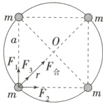 四颗星稳定分布在边长为$a$的正方形的四个顶点上,以正方形对角线的交点$O$为圆心、以顶点到对角线的交点的距离为半径做匀速圆周运动,其他三颗星体的万有引力的合力提供向心力,如图所示。
